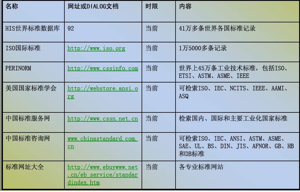 其它网站 中国环境标准网:免费查询下载国家环境标准、环境保护标准的全文,包括水环境标准、大气环境标准、固废污染控制标准、移动源排放标准、环境噪声标准、土壤环境标准、放射性环境标准、生态保护标准、环境基础标准、其它环境标准。 国家标准化管理委员会:可检索国家标准目录,获得标准的题录信息,并了解标准化动态、国家标准制订计划、国标修改通知等信息。 国家军用标准化信息网:免费查询中国军用标准、美国军用标准、法国宇航标准、北约标准目录及北约出版物等的标准题录信息。 北京市质量技术监督信息网:免费检索国家标准、行业标准、ISO、IEC、欧洲标准、地方标准、北京企业标准等目录,提供网上订购全文服务。 国外主要网站和数据库 世界标准服务网 www.wssn.net 世界标准服务网主要功能是提供国际、国家、地区标准化组织和标准主体的链接和搜索,但不提供标准搜索。 http://www.cssinfo.com/perinorm.html 美国ISI集团旗下Techstreet 公司开发的标准数据库。被称为:The Premier International Standards Database(第一国际标准数据库),提供了世界上45万余条标准,包括ISO,ETSL,ASTM,ASME,IEEE等组织制定的标准,可以看到简要说明,用户注册后可以购买原文。 |