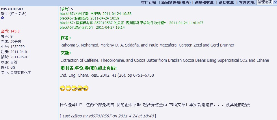 请参加文献版马甲行为定义及处理规范 https://muchong.com/bbs/viewthread.php?tid=1778601 一、马甲行为的认定: 1、一人注册多ID相互求助应助,即一ID求助,一ID应助,非法转移金币; 2、没有任何事由,在本版转移金币。 3、以转移金币为目的,一人在本版发帖求助,另一人应助 4、一人注册多ID同时或者同一天先后求助。 5、借用别人ID同天多量求助。(注:多量求助主要指违反版规“一天最多发3帖”的规定,或违反“绿色求助版一天最多可求助5帖文献”的规定。) 6、对论坛规定的其他马甲行为见https://muchong.com/bbs/viewthread.php?tid=1996653 你的行为符合其中第4条,为典型的马甲求助行为! |