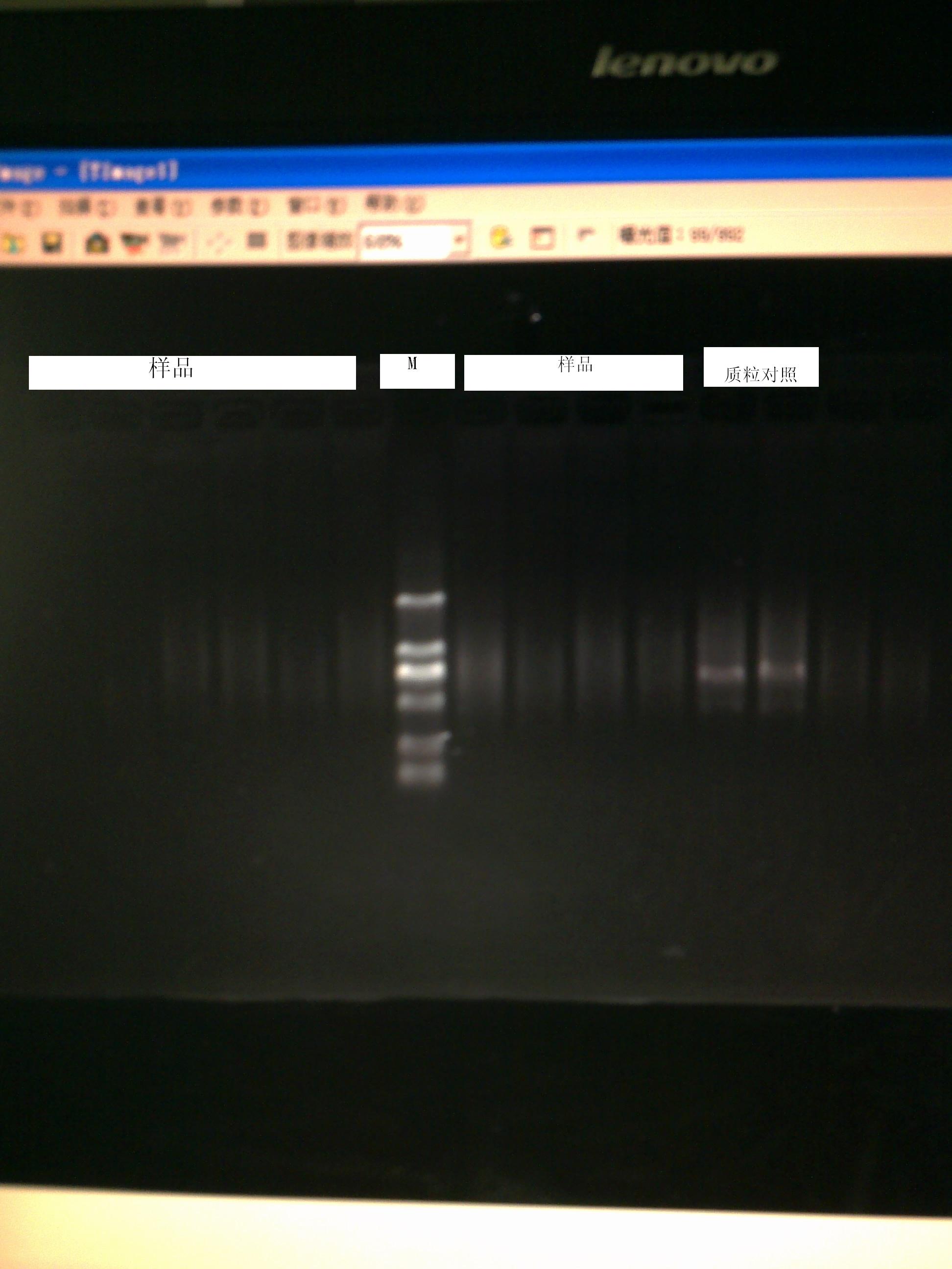 这几次pcr产物的电泳图,上样孔都会很亮,而且从上样孔开始会有白色的弥散,一直拖到我们的目的条带长度左右,这是今天做的PCR产物电泳图,上样孔正常了,但是目的条带附近又是一段弥散,看得到条带的是质粒的pcr产物,是产物降解了吗?会不会是试剂污染了呢?(目标片段在720bp) |