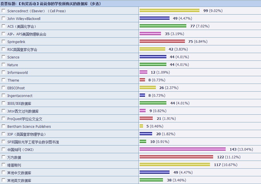 上月在本版开展了【有奖活动】“说说你的学校所购买的数据库”,经过近一个月的调查,虫友们的积极参与,现公布下调查结果: 活动链接: http://muchong.com/bbs/viewthread.php?tid=3065297&fpage=0&view=&highlight=&page=1 投票结果: 结果讨论: 订阅最多的数据库为三大中文数据库: 中国知网,万方数据,维普期刊 订阅最多的外文数据库为: Sciencedirect(Elsevier)(Cell Press),ACS(美国化学会),Springerlink 订阅较多的外文数据库有: John Wiley+Blackwell,RSC英国皇家化学会,Science,Nature,IEEE/IEE数据库,AIP,APS美国物理联合会 其余数据库订阅的学校很少,属于稀缺数据库。 |