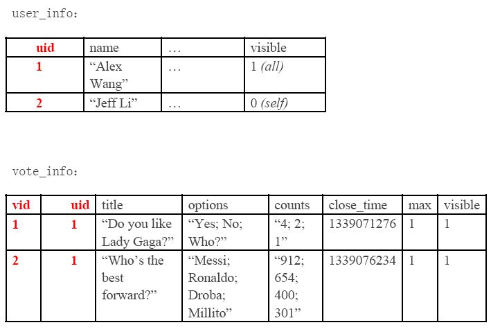 系统设计题 百度打算开发一个投票系统,它提供创建、查看、参与和管理投票功能。用户创建一个投票时,有如下信息可知:创建者、标题、各选项内容、截止时间、可投票数。另外,该投票是否对所有用户可见继承于创建者的个性设置。查看一个投票时,除了显示上述信息外,还需要显示每个选项的投票数。在截止时间之前,用户可以参与投票。管理投票功能为创建者提供删除一个投票和调整进行中投票截止时间的功能。预计该投票系统会很受用户欢迎,每天可望创建超过1万个投票。每天浏览次数达数百万,并且有约一百万人次参与投票。经验还表明,用户更喜欢新近的内容。实习生小A针对上述需求,打算用数据库来实现这个投票系统,他给出了数据库的表设计如下: user_info:uid name … visible vote_info:vid uid title options counts close_time max visible 红色为主键 问题: 1、小A的设计存在什么问题,如何改善? 2、如果想增加一个功能,即每个用户对每个投票只能投一次。如何设计? 3、系统运行了较长一段时间之后,用户反馈使用中速度变慢。请分析可能的原因,并提出解决办法。 4、请完整给出新系统下各功能的实现流程。涉及数据库查询的,请给出SQL语句。 |