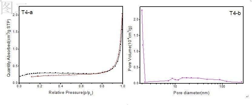 我帮你分析一下,呵呵 你的T4样品的比表面积应该不是很大,实验时样品量用少了,脱附线跑到了吸附线的下面,这种数据在写论文时是不能用的; T2要比T4的比表面积大一些,但这两种材料均会含有一定数量的微孔(《2nm),当然含量不会太多。另外你可以用dV/dlogD作图看看,这样在较宽范围的孔径分布可能会更清楚一些。 |