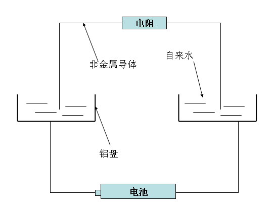 如下图所示的电学实验,两个铝盘,装满自来水,各自接上电池的正负极。两个铝盘的水中各放在两根非金属的导电材料,中间接有电阻。 实验结束后,出现的现象有:两个金属盘中出现有小气泡,并且铝盘上有类似腐蚀的情况发生。 那么,请教一下大家,在这个实验中,两个铝盘中各发生了什么反应呢? 谢谢大家。 |