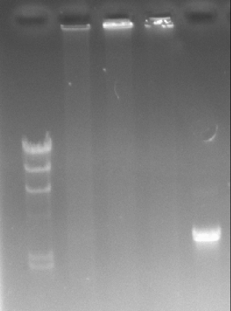 PCR产物胶回收后,以回收的DNA为模板,再进行PCR,怎么PCR的产物跑电泳时跑不出孔啊。最右边的是我回收的条带,作为模板