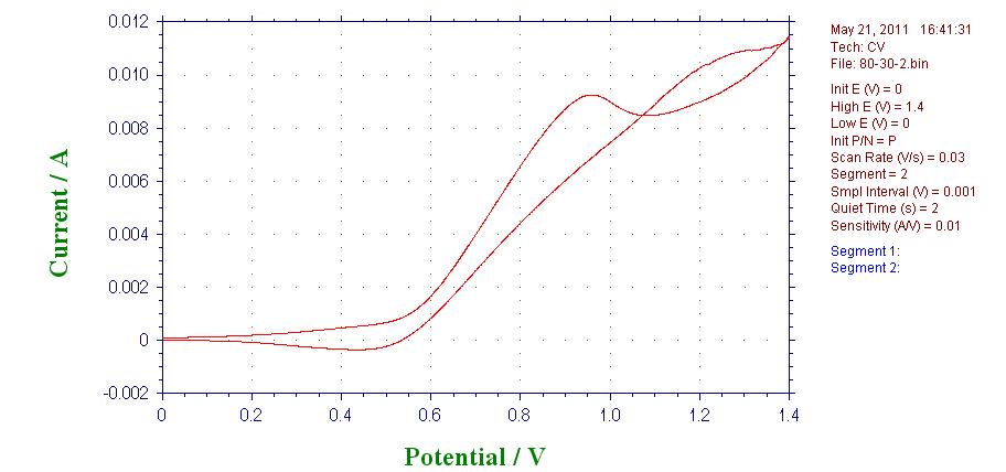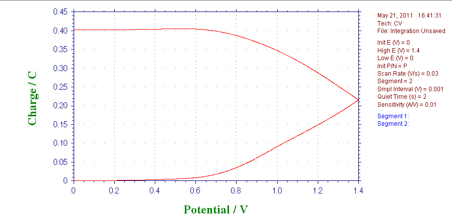 请问,我看到一篇关于算铜的覆盖率的,需要用到氧化还原峰下的电荷,如果我用工作站的积分得到的图是下面这样的,我需要的电荷应该是哪一部分?这个电荷值怎么算?一个是积分的图,一个是原始的CV图。