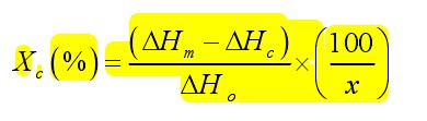 鄙人愚钝,请问各位冷结晶焓是正的还是负的啊?我在分析软件上得到的是负值,可看了好多文献有的是正的有的是负的(也可能与结晶的方法不同有关吧)。我做的是冷结晶。另外在计算共混物中其中一种成分的结晶度的时候,代入正值还是负值呢?公式见图片 |