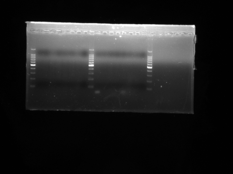 1.在我看来,你这个是PCR没有扩增出产物。你标出来的两条带很小且模糊,很可能是引物二聚体。PCR扩增不出来的原因实在太多了,不好说。 2.Maker跑得很好,条带亮,没有拖尾(没有降解,电泳中没有污染DNA酶),泳道也端端正正,说明做胶(琼脂糖、EB、缓冲液等等)、上样操作、电泳、拍照都没有大问题。当然如果偏巧就是PCR产物那几个孔破了或者没上到样品,或者PCR产物降解什么的,我就没话说了…… 3.你说胶不好,我不认为,我觉得挺好的: (1)“白的白,黑的黑”:【1】你这个胶应该是配胶时就加了EB吧。电泳的时候,EB会从正极向负极移动(与DNA反向)。你看你的胶,下半部是黑的,上半部是白的,那是因为EB都移到上面去了,所以上半部背景会更亮。【2】你标出来的那两条带上面,有一条黑带,应该是溴酚蓝(电泳时看到的那条蓝色的线)。【3】maker最上那条带的位置,有一道黑线,这个我就不懂了。可能也是上样缓冲液的指示剂(类似溴酚蓝)。你跑电泳时看到这个位置有颜色吗? (2)“脏东西”:【1】可能是加EB加晚了,此时琼脂糖快凝固了,EB分散不开。加EB后记得摇匀。【2】我更倾向这个原因:机器不干净。就是说你拍照的仪器,放胶的那个地方可能脏了。这个很常见的。我们一般是铺层保鲜膜,再把胶放上去拍照,觉得脏了就换一张保鲜膜。 (3)“锥形瓶洗干净”:我们跑胶,锥形瓶、梳子、模具这些几乎不洗的,没问题滴! 你说同学的好,不如也贴上来比较比较吧。 啰嗦了一堆,观点就一个:电泳很好,PCR可能有问题。 |