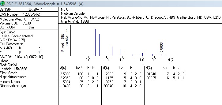 | 请各位,做了个X射线,想求助NbC 和NbN的x射线PDF卡。谢谢各位! |