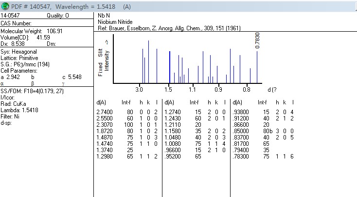 PDF#38-1364: QM=Star(+); d=Diffractometer; I=Diffractometer Niobocarbide, syn Nb C (Black) Radiation=CuKa1 Lambda=1.5405981 Filter=Graph Calibration=Internal(Si) d-Cutoff=17.7 I/Ic(RIR)= Ref= Wong-Ng, W., McMurdie, H., Paretzkin, B., Hubbard, C., Dragoo, A., NBS, Gaithersburg, MD, USA. ICDD Grant-in-Aid (1986) Cubic - Powder Diffraction, Fm-3m (225) Z=4 mp= Cell=4.4698 Pearson=cF8 (Cl Na) Density(c)=7.804 Density(m)=8.10A Mwt=104.92 Vol=89.30 F(10)=137.0(.0073,10) Ref= Wong-Ng, W., McMurdie, H., Paretzkin, B., Hubbard, C., Dragoo, A. Powder Diffraction, 3 55 (1988) Strong Line: 2.58/X 2.24/8 1.58/4 1.35/3 1.00/1 1.29/1 1.03/1 0.91/1 0.86/1 1.12/1 NOTE: The mean temperature of the data collection was 25.5 C. The structure of NbC was determined by Rudy et al. (1). The sample was from Alfa Products, Danvers, Massachusetts, USA. To replace 00-010-0181. Spectroscopic analysis indicated impurities of Ta 0.02%, Ti 0.01%, and Fe 0.07%. d(A) I(f) I(v) h k l n^2 2-Theta Theta 1/(2d) 2pi/d 2.5809 100.0 100.0 1 1 1 3 34.730 17.365 0.1937 2.4345 2.2352 80.0 92.0 2 0 0 4 40.316 20.158 0.2237 2.8110 1.5804 35.0 57.0 2 2 0 8 58.337 29.169 0.3164 3.9756 1.3477 26.0 50.0 3 1 1 11 69.718 34.859 0.3710 4.6622 1.2903 9.0 18.0 2 2 2 12 73.306 36.653 0.3875 4.8695 1.1176 5.0 12.0 4 0 0 16 87.139 43.569 0.4474 5.6221 1.0253 7.0 18.0 3 3 1 19 97.401 48.701 0.4877 6.1281 0.9994 10.0 26.0 4 2 0 20 100.841 50.420 0.5003 6.2869 0.9124 7.0 20.0 4 2 2 24 115.179 57.589 0.5480 6.8864 0.8603 6.0 18.0 5 1 1 27 127.121 63.561 0.5812 7.3038 PDF#14-0547: QM=Doubtful(?); d=(Unknown); I=Film/Visual Niobium Nitride Nb N Radiation=CuKa Lambda=1.5418 Filter=Ni Calibration= d-Cutoff= I/Ic(RIR)= Ref= Brauer, Esselborn. Z. Anorg. Allg. Chem., 309 151 (1961) Hexagonal - Powder Diffraction, P63/mmc (194) Z=2 mp= Cell=2.942x5.548 Pearson=hP4 (As Ni) Density(c)=8.390 Density(m)=8.66A Mwt=106.91 Vol=41.59 F(18)=3.7(0.179,27) Ref= Ibid. Strong Line: 2.31/X 2.74/8 1.87/8 0.85/8 1.49/8 1.47/8 1.01/8 0.78/8 1.30/7 0.95/7 NOTE: The composition Nb N0.99 is designated as $GD. O assigned because average $VD2$GU is 0.179. d(A) I(f) I(v) h k l n^2 2-Theta Theta 1/(2d) 2pi/d 2.7400 80.0 30.0 0 0 2 32.655 16.327 0.1825 2.2931 2.5500 60.0 25.0 1 0 0 35.164 17.582 0.1961 2.4640 2.3070 100.0 45.0 1 0 1 39.010 19.505 0.2167 2.7235 1.8720 80.0 45.0 1 0 2 48.595 24.297 0.2671 3.3564 1.4870 75.0 53.0 1 0 3 62.398 31.199 0.3362 4.2254 1.4740 75.0 53.0 1 1 0 63.011 31.505 0.3392 4.2627 1.3740 25.0 19.0 68.196 34.098 0.3639 4.5729 1.2980 65.0 52.0 1 1 2 72.802 36.401 0.3852 4.8407 1.2740 15.0 12.0 2 0 0 74.402 37.201 0.3925 4.9319 1.2430 60.0 50.0 2 0 1 76.588 38.294 0.4023 5.0549 1.2110 20.0 17.0 78.999 39.499 0.4129 5.1884 1.1580 35.0 32.0 2 0 2 83.392 41.696 0.4318 5.4259 1.0480 40.0 40.0 2 0 3 94.614 47.307 0.4771 5.9954 1.0080 75.0 78.0 1 1 4 99.666 49.833 0.4960 6.2333 0.9660 15.0 16.0 2 1 0 105.763 52.882 0.5176 6.5043 0.9520 65.0 71.0 108.020 54.010 0.5252 6.6000 0.9380 15.0 17.0 2 0 4 110.409 55.204 0.5330 6.6985 0.9120 40.0 46.0 2 1 2 115.259 57.630 0.5482 6.8895 0.8660 20.0 24.0 125.613 62.807 0.5774 7.2554 0.8500 80.0 98.0 3 0 0 129.974 64.987 0.5882 7.3920 0.8370 40.0 50.0 2 0 5 133.936 66.968 0.5974 7.5068 0.8170 65.0 83.0 141.060 70.530 0.6120 7.6906 0.7940 35.0 46.0 151.920 75.960 0.6297 7.9133 0.7830 75.0 100.0 1 1 6 159.317 79.658 0.6386 8.0245 |
