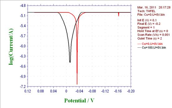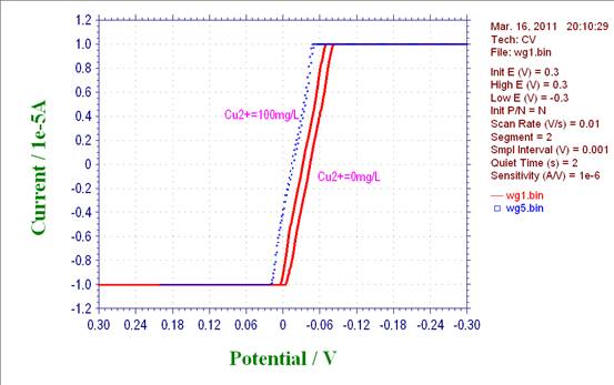 新手求教,我采用循环伏安法和tafel曲线研究铜离子的电沉积现象,实验条件:pH=4,工作电极、辅助电极均为1平方厘米的铜电极,参比电极为甘汞电极,试验结果曲线诡异,不知道是正常现象还是其它原因致使,请不吝赐教!谢谢! |
