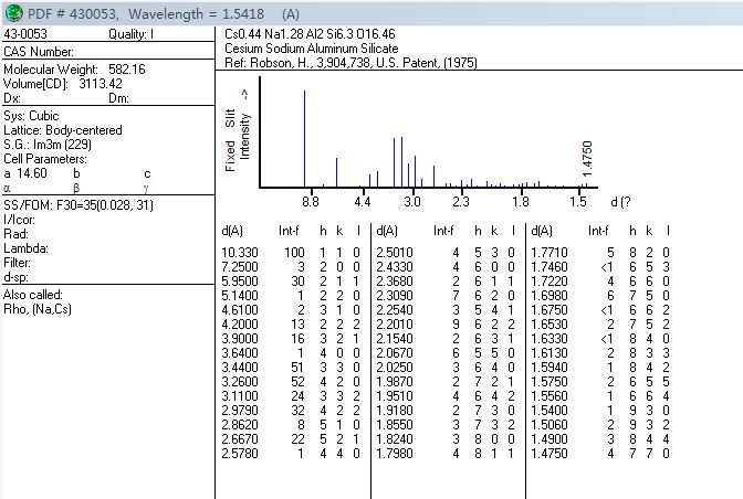 PDF#43-0053: QM=Doubtful(?); d=Other/Unknown; I=(Unknown) Rho, (Na,Cs) Cs0.44Na1.28Al2Si6.3O16.46 Radiation=CuKa1 Lambda=1.5406 Filter= Calibration= d-Cutoff= I/Ic(RIR)= Ref= Level-1 PDF Cubic, Im-3m(229) Z= mp= Cell=14.602x14.602x14.602<90x90x90> Pearson= Density(c)=0.31 Density(m)= Mwt= Vol= Ref= Ibid. Strong Line: 10.33/X 3.26/5 3.44/5 2.98/3 5.95/3 3.11/2 2.67/2 3.90/2 d(A) I(f) I(v) h k l n^2 2-Theta Theta 1/(2d) 2pi/d 10.3300 100.0 61.0 1 1 0 2 8.553 4.276 0.0484 0.6082 7.2500 3.0 3.0 2 0 0 4 12.198 6.099 0.0690 0.8666 5.9500 30.0 32.0 2 1 1 6 14.877 7.438 0.0840 1.0560 5.1400 1.0 1.0 2 2 0 8 17.238 8.619 0.0973 1.2224 4.6100 2.0 3.0 3 1 0 10 19.237 9.619 0.1085 1.3629 4.2000 13.0 19.0 2 2 2 12 21.136 10.568 0.1190 1.4960 3.9000 16.0 26.0 3 2 1 14 22.783 11.391 0.1282 1.6111 3.6400 1.0 2.0 4 0 0 16 24.434 12.217 0.1374 1.7261 3.4400 51.0 93.0 3 3 0 18 25.879 12.939 0.1453 1.8265 3.2600 52.0 100.0 4 2 0 20 27.334 13.667 0.1534 1.9274 3.1100 24.0 48.0 3 3 2 22 28.680 14.340 0.1608 2.0203 2.9790 32.0 67.0 4 2 2 24 29.970 14.985 0.1678 2.1092 2.8620 8.0 18.0 5 1 0 26 31.226 15.613 0.1747 2.1954 2.6670 22.0 52.0 5 2 1 30 33.575 16.787 0.1875 2.3559 2.5780 1.0 2.0 4 4 0 32 34.770 17.385 0.1939 2.4372 2.5010 4.0 10.0 5 3 0 34 35.876 17.938 0.1999 2.5123 2.4330 4.0 10.0 6 0 0 36 36.914 18.457 0.2055 2.5825 2.3680 2.0 5.0 6 1 1 38 37.966 18.983 0.2111 2.6534 2.3090 7.0 19.0 6 2 0 40 38.975 19.487 0.2165 2.7212 2.2540 3.0 8.0 5 4 1 42 39.966 19.983 0.2218 2.7876 2.2010 9.0 26.0 6 2 2 44 40.971 20.485 0.2272 2.8547 2.1540 2.0 6.0 6 3 1 46 41.906 20.953 0.2321 2.9170 2.0670 6.0 18.0 5 5 0 50 43.759 21.880 0.2419 3.0398 2.0250 3.0 9.0 6 4 0 52 44.715 22.358 0.2469 3.1028 1.9870 2.0 6.0 7 2 1 54 45.618 22.809 0.2516 3.1621 1.9510 4.0 13.0 6 4 2 56 46.509 23.254 0.2563 3.2205 1.9180 2.0 7.0 7 3 0 58 47.357 23.679 0.2607 3.2759 1.8550 3.0 10.0 7 3 2 62 49.070 24.535 0.2695 3.3872 1.8240 3.0 10.0 8 0 0 64 49.960 24.980 0.2741 3.4447 1.7980 4.0 14.0 8 1 1 66 50.733 25.367 0.2781 3.4945 1.7710 5.0 18.0 8 2 0 68 51.563 25.782 0.2823 3.5478 1.7460 1.0 4.0 6 5 3 70 52.357 26.178 0.2864 3.5986 1.7220 4.0 15.0 6 6 0 72 53.143 26.572 0.2904 3.6488 1.6980 6.0 22.0 7 5 0 74 53.955 26.977 0.2945 3.7003 1.6750 1.0 4.0 6 6 2 76 54.757 27.379 0.2985 3.7512 1.6530 2.0 8.0 7 5 2 78 55.549 27.774 0.3025 3.8011 1.6330 1.0 4.0 8 4 0 80 56.289 28.144 0.3062 3.8476 1.6130 2.0 8.0 8 3 3 82 57.050 28.525 0.3100 3.8953 1.5940 1.0 4.0 8 4 2 84 57.794 28.897 0.3137 3.9418 1.5750 2.0 8.0 6 5 5 86 58.559 29.279 0.3175 3.9893 1.5560 1.0 4.0 6 6 4 88 59.345 29.672 0.3213 4.0380 1.5400 1.0 4.0 9 3 0 90 60.024 30.012 0.3247 4.0800 1.5060 2.0 8.0 9 3 2 94 61.524 30.762 0.3320 4.1721 1.4900 3.0 13.0 8 4 4 96 62.258 31.129 0.3356 4.2169 1.4750 4.0 17.0 7 7 0 98 62.963 31.482 0.3390 4.2598 |