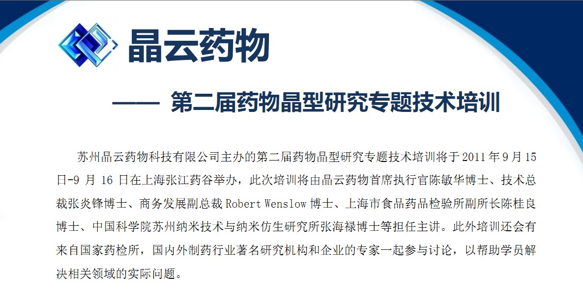 晶云药物将举办第二届药物晶型研究专题技术培训 由苏州晶云药物科技有限公司主办的第二届药物晶型研究专题技术培训将于2011年9月15日-9月16日在上海张江药谷盛大开幕,此次培训将由晶云药物首席执行官陈敏华博士、技术总裁张炎锋博士、商务发展副总裁Robert Wenslow博士、中国科学院苏州纳米技术与纳米仿生研究所张海禄博士、以及上海市食品药品检验所副所长陈桂良博士等担任主讲。此外培训还会有来自国家药检所,国内外制药行业著名研究机构和企业的专家一起参与讨论,以帮助学员解决相关领域的实际问题。 在成功举办国内首届药物晶型专题培训基础上,本届培训还将延续精彩!为进一步提高全国制药企业对药物晶型以及固态信息的认识和理解,本次培训课程由晶云药物为仿制药和新药研发企业量身设计,围绕药物晶型研究设置各个课程,针对药物研发生产进行案例分析,通过主题讲座、现场互动,案例分析等形式使参训学员以各自特定的需求为出发点,结合药物晶型研究理念的探讨,提高各制药企业对药物晶型研究的认识,以应对当前药物研发过程中出现的困难和问题,共同推进国内制药行业整体水平的提高。这是晶云药物举办的第二届专题技术培训,晶云希望藉此为促进行业内深入广泛的交流提供一个和谐与开放式的交流平台。 “我们根据制药企业的需求来设计全部课程”,晶云药物CEO 陈敏华博士说,“不管是新药开发,还是仿制药生产,药物晶型研究都是必不可少的中心环节。晶云药物将每年举办两期这类专题培训,借助培训平台挖掘并有效沟通以解决目前企业面临的晶型研发领域的许多实际问题。” 了解培训详细请登陆:www.polymorph.com.cn |