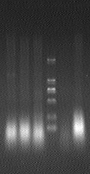 谢谢大家的热心,心里很温暖![]() 这个本身就是退火温度的PCR,从左到右分别是55,57,61,63和65度。 反映体系是:ddH2O 17.5μL 10×Taq reaction buffer 2.5μL dNTP(2.5mM) 1μL P1(10μM) 1μL P2(10μM) 1μL 基因组DNA 1μL Taq DNA polymerase(2.5U/μL) 1μL Total Vol. 25μL 55的在1000Bp左右有个微弱的带。。。 大家看这个体系有问题吗? |