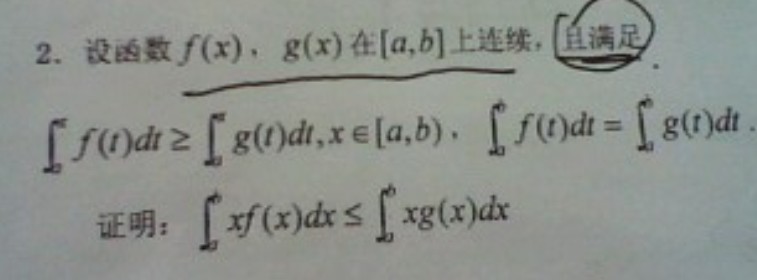 设 f(x) 和 g(x) 的原函数是 F(x) 和 G(x), 根据条件 F(a)=F(b)=0, F(b)=G(b) and F(x)>=G(x), x\in [a,b]