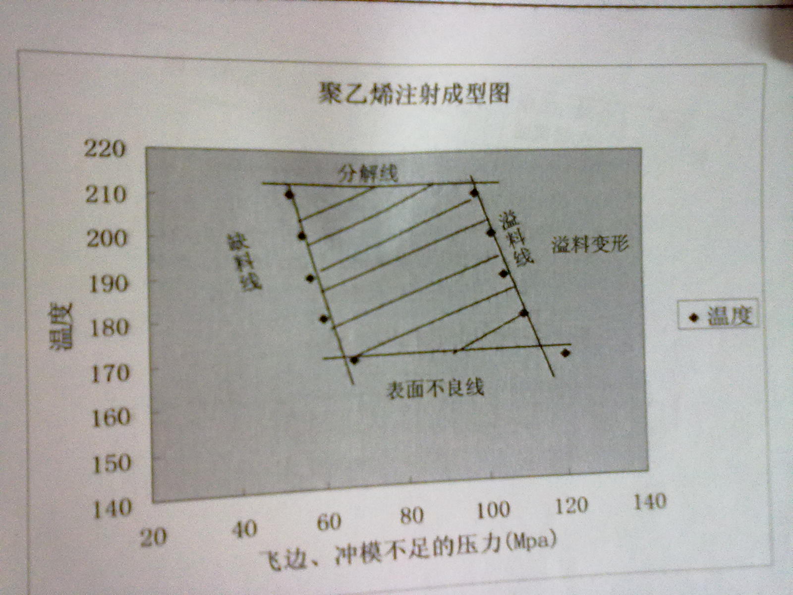 温度 170 180 190 200 210 飞边压力 83 80 78 76 74 冲模不足 42 40 36 34 32 类似于下面图片,请各位帮忙,谢谢,是聚乙烯的注射成型图,温度为摄氏度,压力为Mpa [ Last edited by 沐容婧baby on 2011-5-21 at 21:51 ] |