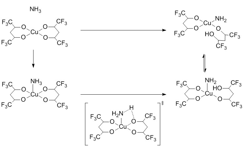 反应式为 Cu(hfac)2 + NH3 -->Cu3N + Hhfac , Cu(hfac)2的结构式为如下面的图片,请哪位高手帮忙解决下如何寻找过渡态结构,需要给出输入的文件