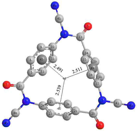 我用B3LYP方法,两种不同的基组,求Li+,Na+与所设计结构的结合能,结果3-21g*求得的Na+的结合能比较大,而用6-31+g**求得的Li+的结合能比较大,请问这是怎么回事? 图中47,49号(错误)无原子,当时画图时忘记缩小了 [ Last edited by zhulty on 2011-5-23 at 21:58 ] |
