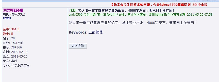 https://muchong.com/bbs/viewthread.php?tid=3232164 该虫子在管理把发布代写论文求助帖。 管理版版规 因此对该虫子处罚50金币并没收求助金币,删除帖子并永久禁止访问本版。特此备案。 |