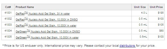 http://www.biotium.com/product/p ... GelRed_GelGreen.asp 这个对你有用 一般可以用GelRed 0.5ml 600元左右吧,GelGreen比较贵些,安全性好些,因为EB可以渗透细胞膜,而GelRed和GelGreen不会渗透细胞膜所以增加了安全性~具体的看网页,我一直再用GelRed。 |