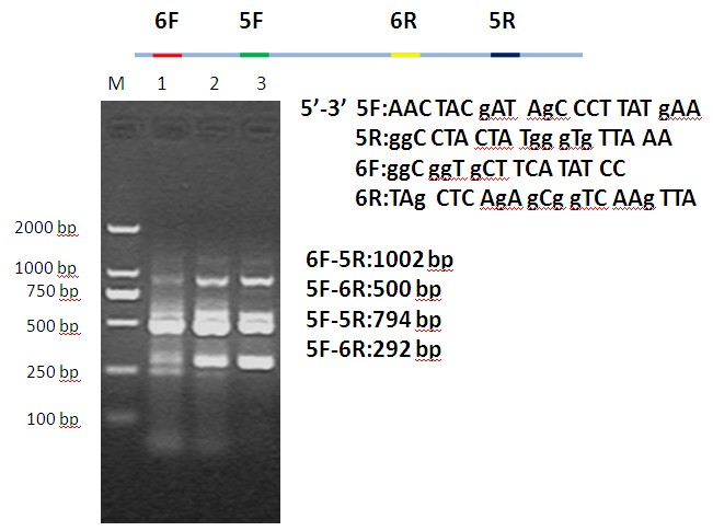 采用两对引物扩增,引序列和电泳结果均标注在图上,1,2,3为平行实验。扩增的条带应有1002 bp,500 bp, 794bp, 292bp,但是电泳后无794 bp条带,却出现一500多bp的条带,请高人指教是怎么回事,谢谢! |