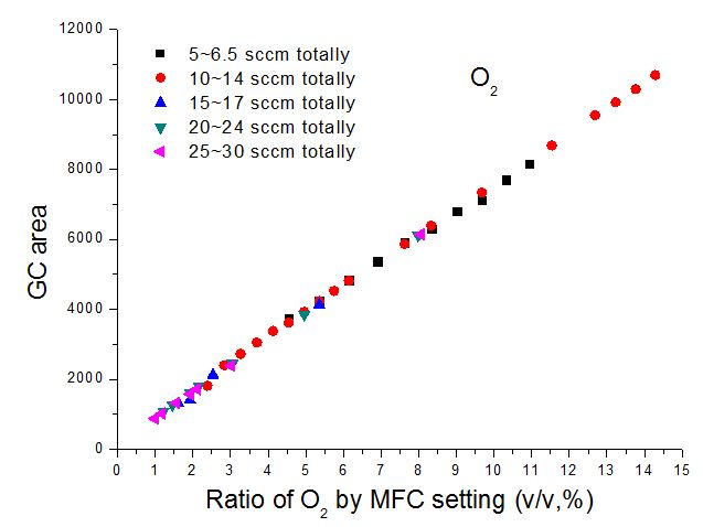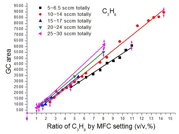 本人做丙烷氧化脱氢动力学,现在做准备实验,首先测试不同空速下不同浓度气体的配比,丙烷:氧气=1:1通过BROOKS 的MFC,He平衡,安捷伦7890A检测峰面积,得到如下曲线: 问题是: 相近浓度的O2能得到较好的线性曲线,为什么丙烷线性这么差? |
