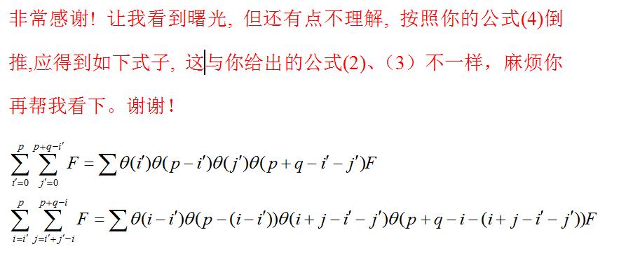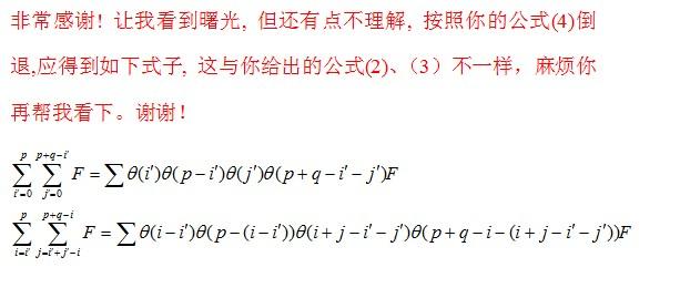 不能理解从第一步如何推导到第二步,主要不明白西格玛下标变量的转换和其作用范围,请知道的虫友指教,谢谢!!! [ Last edited by jjgy_2002 on 2011-5-27 at 22:08 ] |