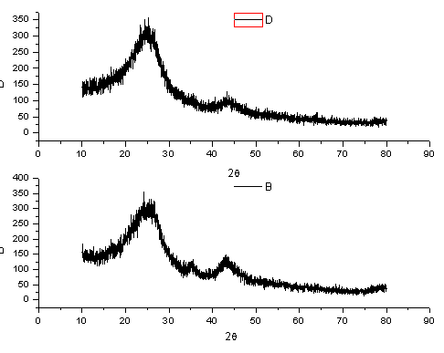 我用活性炭负载铁做催化剂,活性炭是外购的,用浸渍法负载硝酸铁,在200度烧7h, 得到的负载铁的活性炭,这两张图就是负载不同量的铁的活性炭XRD图,峰很宽,看不出什么结果,希望大家能帮我分析一下,谢谢! |