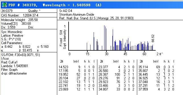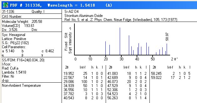 最近做研究,用jade软件分析XRD图,总出问题,PDF卡老是输入不进去,又考虑是不是可以找到那些卡片,由卡片进行分析,哪位有铝酸锶的PDF卡?求送?截图上来也行。