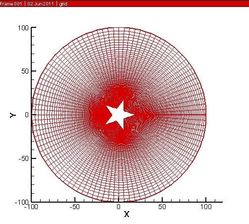 我需要用matlab画网格,图形区域是一个圆,里面有一个挖空的五角星,同学给我讲的原理是五角星和圆上的点应该是一一对应,然后再连接个点,变成网格,他们都是用C编的,我需要用matlab,该怎么整呢,快急死了,求助求助啊!那个边界图形的代码是:function h=new(x,y,HRadium,LRadium) angle=18;radian=pi/180;x=50;y=50;HRadium=30;LRadium=10; for i=1:11 if rem(i,2)==1 % xlabel(i)=HRadium*cosd(angle+36*(i-1)); ylabel(i)=HRadium*sind(angle+36*(i-1)); else xlabel(i)=LRadium*cosd(angle+36*(i-1)); ylabel(i)=LRadium*sind(angle+36*(i-1)); end end ylabel(2)=ylabel(1); ylabel(4)=ylabel(5); alpha=0:pi/20:2*pi;%角度[0,2*pi] R=100;%半径 x1=R*cos(alpha); y1=R*sin(alpha); plot(xlabel,ylabel,x1,y1) axis equal |