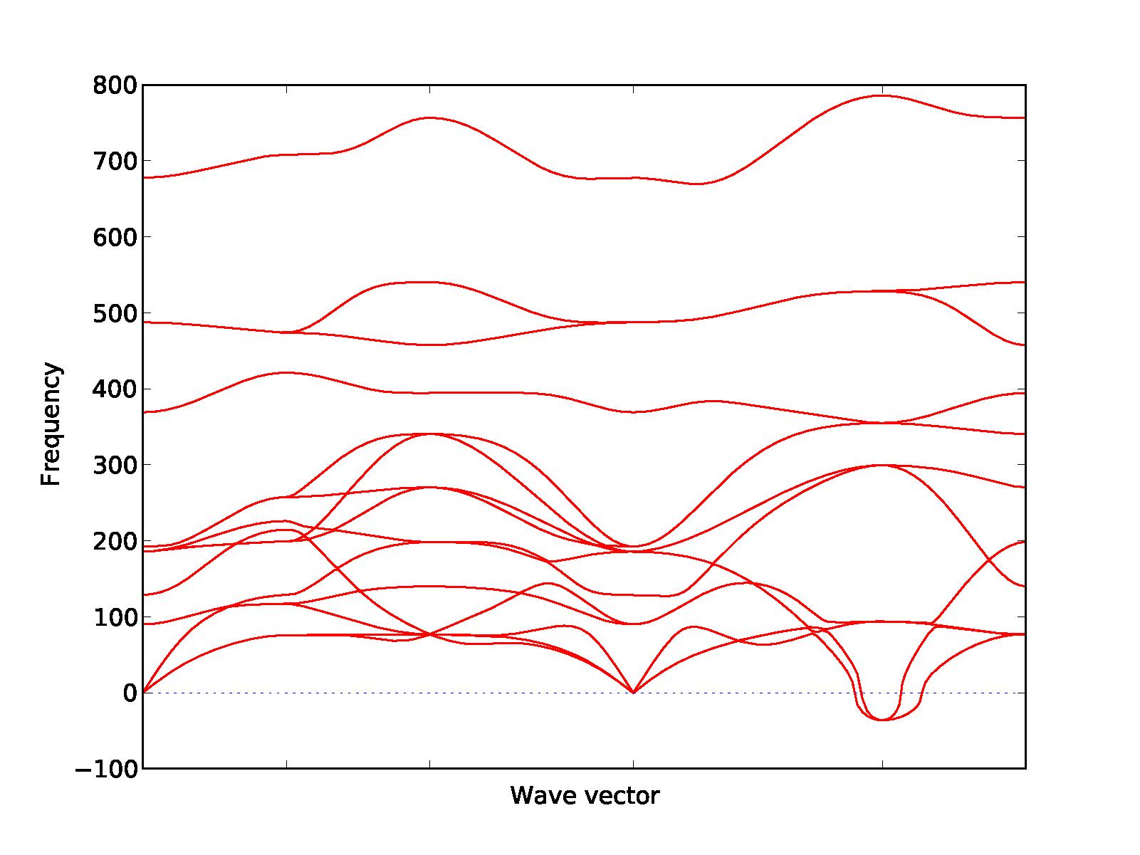 最近看到的一个简单例子是钙钛矿结构的BaZrO3,如果按照Pm3m对称性做DFPT,算出来的Gamma点正常,而R点存在虚频。该虚频简正模式对应的是O八面体的扭转,但是被Pm3m对称性限制住了。如果用2x2x2的单胞做结构优化计算的话(相当于提供了一个内部的自由度而允许对称性的降低),就可以处理这种破坏晶体对称性的特殊简正模式造成的虚频。 一般来说虚频对应的K点都是一些高对称性Gamma,X,M,R点,我还没有见过在某个一般的k点出现虚频的情况 |