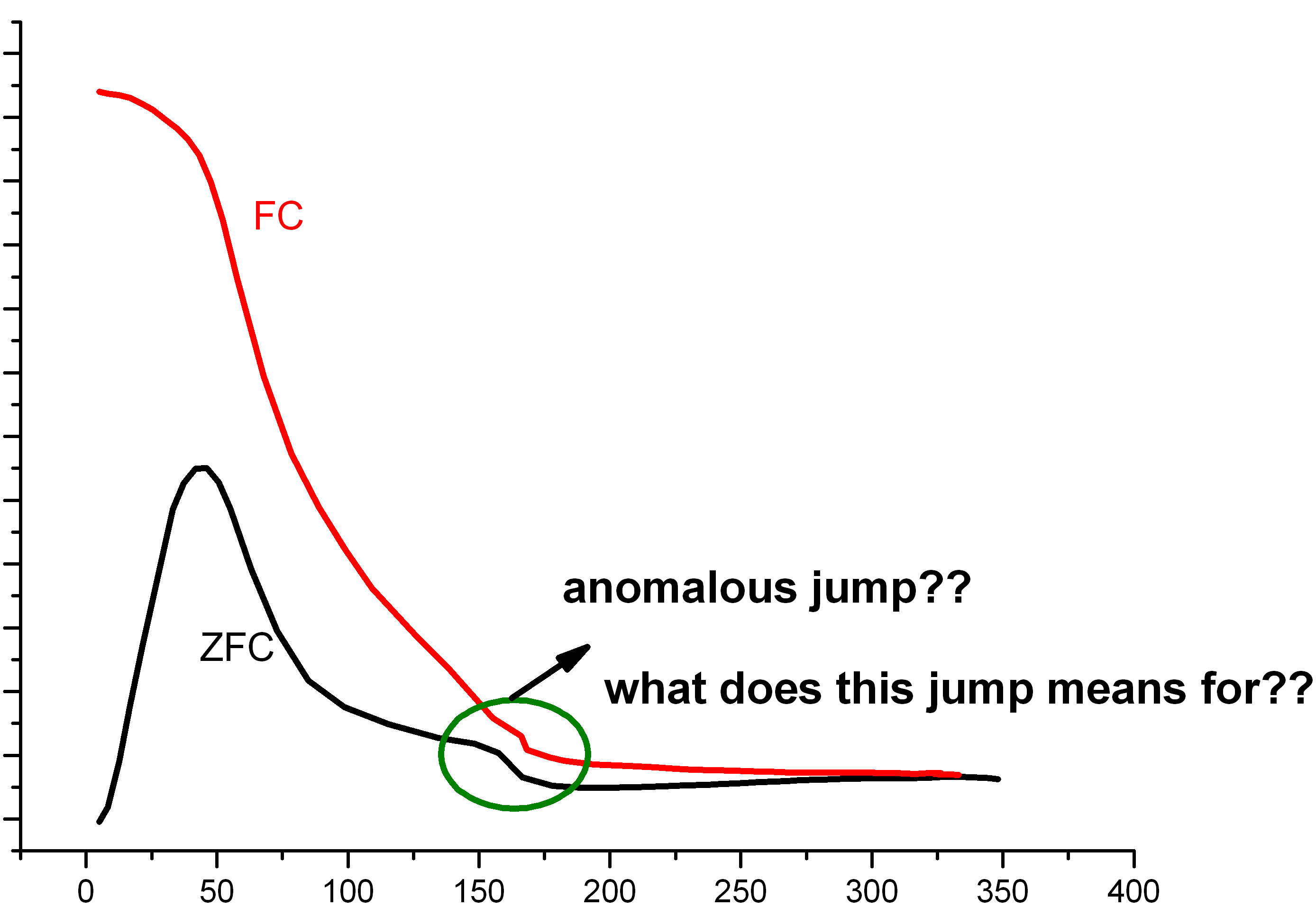 如图所示,所测 ZFC/FC 在 160K 左右有一个跳动,感觉应该是有什么特别的含义吧,(比如物质晶体结构、电子结构的变化,又苦于没其他特别的表征手段)百思不得其解,不知各位大侠是否能给予一些提示或帮助,或者见过类似的图谱,感激不尽啊。。。。 |