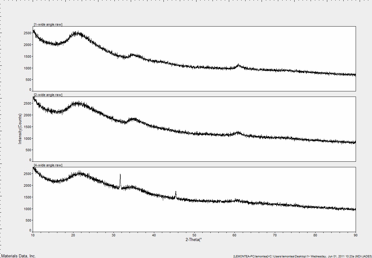 我用SBA-15与硝酸镍混在一起,加尿素沉淀,把Ni沉积上去。为什么XRD的峰是这样的?着到底是非晶还是晶体呢?TEM中看到Ni的形貌也很奇怪,以前做的都是颗粒状分布的,可这个是针状的。 请高手指点。 |