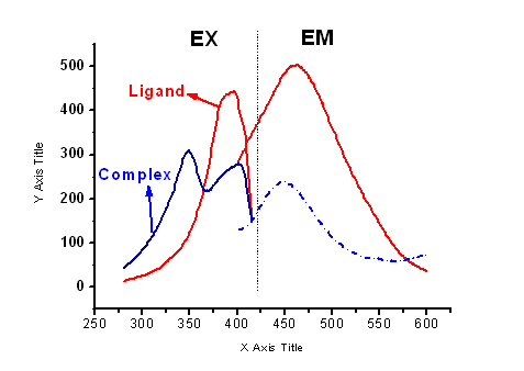 如图,配体激发谱出现一个峰,约在380nm作用,但配位后却多出了一个在346nm的峰。发射谱基本没有什么变化。求助为什么会出现这种现象?ps:我的配合物结构比较复杂,既有d10的一价Cu,也有其他一些非d10的过渡金属。 先谢谢啦! |