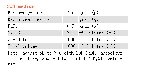 给你标准的如下:(来源于TAKARA) (SOB培养基) 组分浓度:2%(W/V) Tryptone 0.5%(W/V) Yeast Extract 0.05%(W/V) NaCl 2.5mM KCl 10mM MgCl2 配制量 1L 配制方法: 1.配制250mM KCl溶液:在90ml的去离子水中溶解1.86gKCl后,定容 至100ml 2.配制2M MgCl2溶液:在 90ml的去离子水中溶解19gMgCl2,定容 至100ml ,高温高压灭菌 3.称取下列试剂置于1L烧杯中: Tryptone 20g Yeast Extract 5g NaCl 0.5g 4.加入约800ml的去离子水,充分溶解搅拌 5.量取10ml 250mM KCl溶液,加入到烧杯中 6.滴加5N NaCl溶液(约0.2ml).调节pH至7.0 7.加入去离子水将培养基定容至1L 8.高温高压灭菌后,4℃保存 9.使用前加入5ml的2M MgCl2溶液 |