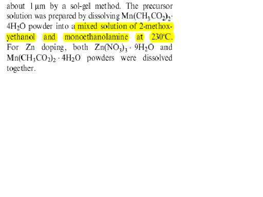 看到一篇文献,把乙酸锰加入到温度230度的乙二醇甲醚和乙醇胺的热混合液中,搅拌,但是问题时如何能达到这个温度呀?我查了一下乙二醇甲醚沸点130度,乙醇胺沸点180度,两者的混合液,加热时在135度时就沸腾了,温度就不会升高了,230度时怎么加上去的呀? 下图是从原文中截取的 [ Last edited by hbf on 2011-6-10 at 20:31 ] |