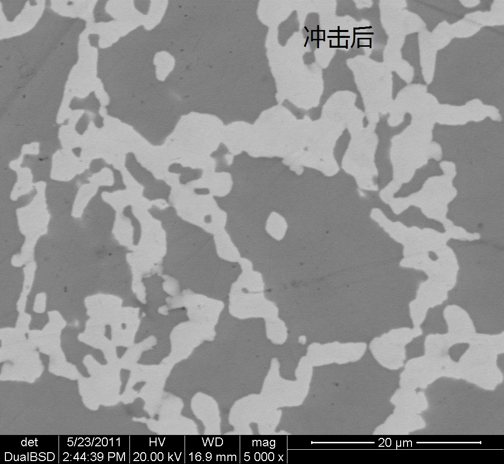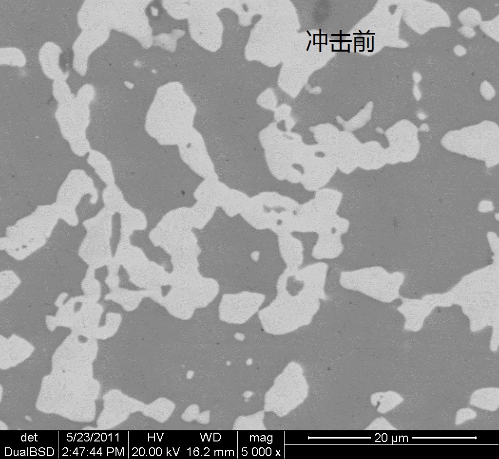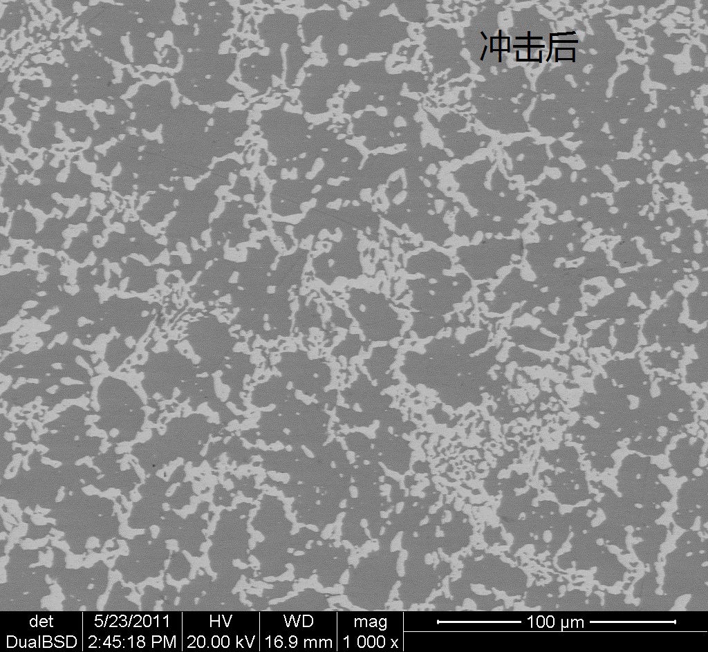 冲击前后看不出什么差异,可能有两种情况,第一种是如6楼说的脆性,破碎应力应变在局部快速松弛,应变不能体现出来,组织无变化;其二,你的观察区在非冲击影响区。