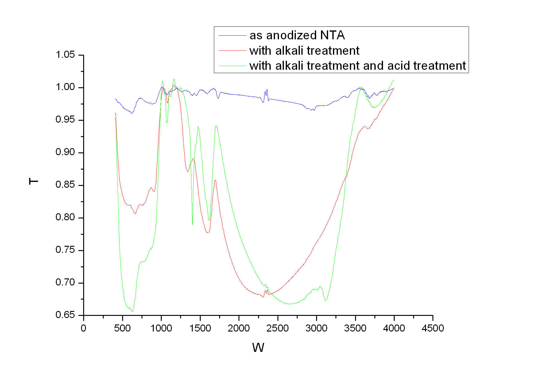 小弟对阳极氧化得到的氧化钛管进行碱处理,然后酸洗。希望看到这些过程中有没有出现生成钛钾共氧化物,进而在酸洗过程中离子交换出现Ti-OH结构。红外图谱很是费解,期待高手解释红外图中出现的大馒头峰,以及3100+处的绿峰能否说明Ti-OH的存在! |