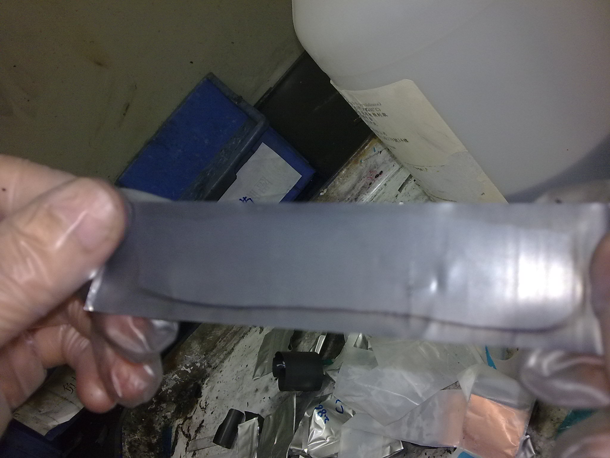 最近做的一批电池,发现做吸液量测试(45度24h)后正极表面出现了如图所示的痕迹。开始以为极片过压,渗透不好,但经检查,极片实际并没有过压。现在不知是什么原因造成的,不知各位大虾有没有碰到这种现象,还请指点迷津~~急急急!!! |