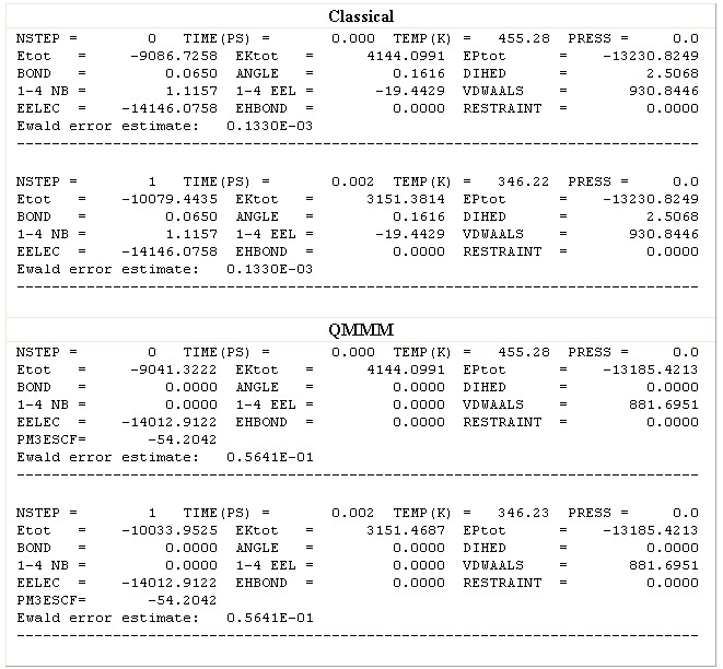 amber中qm/mm的计算,qm是量子化学的方法,这里面的量子化学方法是可以计算所有gaussian里的东西吗?比如说键长,键角,能量,频率等等!!结果怎么读取啊?那个教程里只是把经典的mm和qm/mm的结果最开始的2步比较了一下,说明qm/mm中不包含的项,但是其他结果怎么读去啊??望大虾指教~~~感激涕零~~~ |