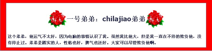 曾经劝说别人从木虫的职务中撤退,但是没有想到自己会去主动申请职务,因为在我心情极其糟糕的时候看到职务申请,便冲动了一下。不过我知道这是一次正确的冲动,原因有两个:一是我得到了好奇很久的vip;另外一个最最最重要的原因是我找到了我的木虫家庭。认识他们是件很幸运、很幸福的事,因为他们让我高兴,他们让我惊喜,他们让我感动,他们让我认识到这个世界上善良、单纯的人很多。如果让我对他们只说一句真心话,我想说:认识你们真好。 下面我来介绍一下我的家庭成员。弟弟妹妹们都很好,不过按照Lady First的选择,我要先介绍我的妹妹。