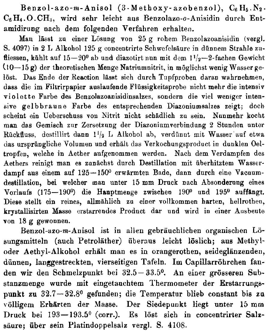 Benzol-azo-m-Anisol  ist in allen gebrauchlichen organischen Losungsmitteln (auch Petrolather) uberaus leicht loslich; ans Methyloder Aethyl-Alkohol erhalt man es in orangerothen, seideglanzendein,dunnen, langgestreckten, vierseitigen Tafeln. Im Capillarrohrchen fanden wir den Scbmelzpunkt bei 32.5-33.5°. An einer grosseren Substanzmenge wurde mit eingetauchtem Thermometer der Erstarrungspunkt zu 32.7-32.8°gefunden; die Temperatur blieb constant bis zu volligem Erharten der Masse. Der Siedepunkt liege unter 15 mm Druck bei 193-193.5° (corr.). Es lost sich in concentrirter Salzsaure;uber sein Platindoppelsalz vergl.