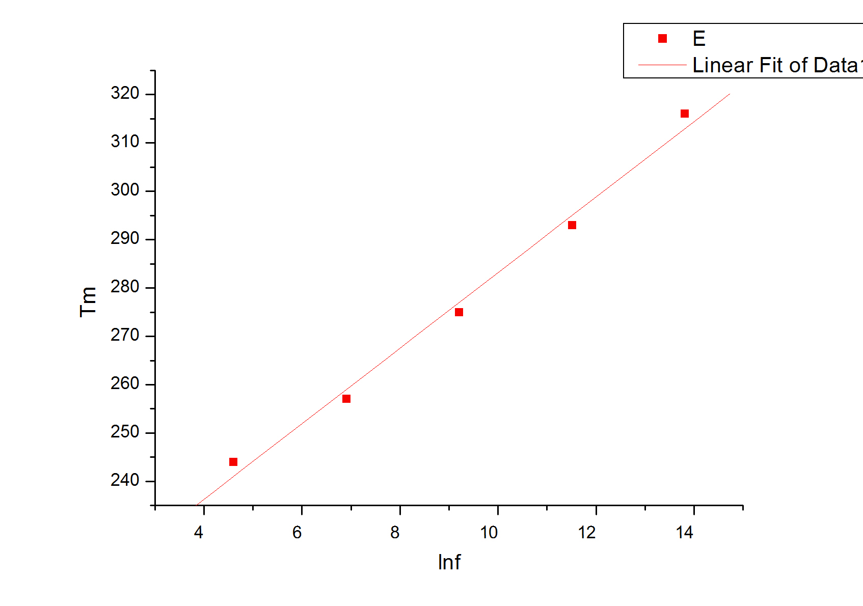 在这个公式中,lnf=lnfo-Ea/Kb(Tm-Tvf) 我知道lnf 和 Tm ,拟合出一条关于lnf v Tm或 lf v 1/Tm 的直线 ,但是怎么从这条直线中得出 Tvf Ea 和 fo 呢??? |