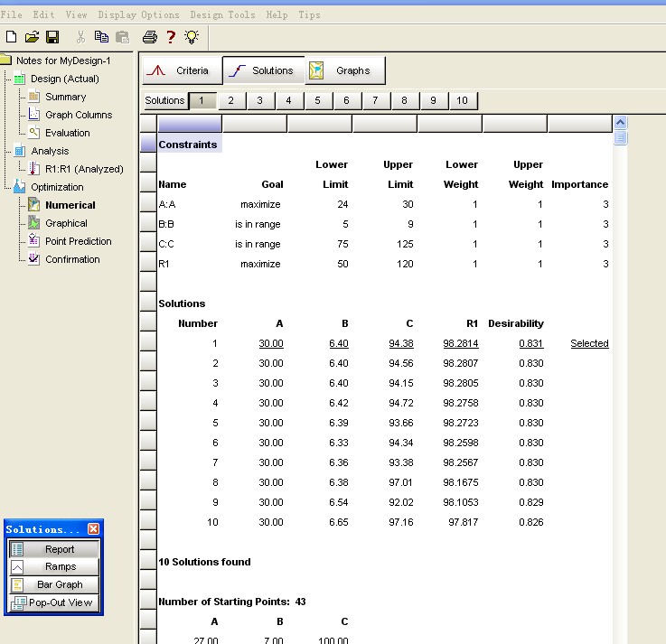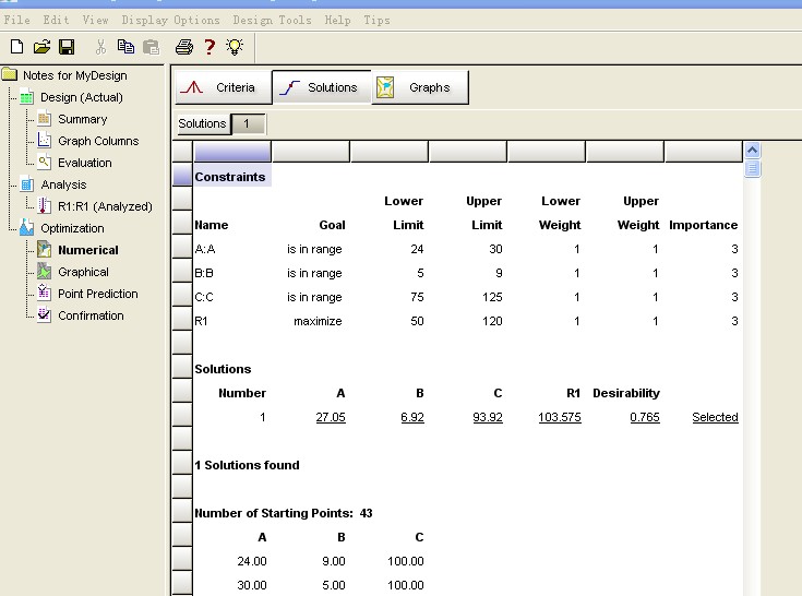 请问我用design expert分析时,最后得出的结论中,所给出的最大值还没有试验中得出最大值大是怎么回事。刚开始时甚至没有最大值这一项,反复尝试几次才出现最大值项,但却不是最大值。还有就是7.1和8.0版本的计算结果不一样。哪位高手能解释一下。 [ Last edited by bio-boy on 2011-7-9 at 13:20 ] |
