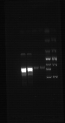 就感觉自己每次跑出的marker 都不好看 更别说样品了 条带总是歪歪扭扭的 波浪形 也不知道和什么有关?还有为什么样品经常会有拖尾呢? 而且,大家帮忙看看 这左边四个泳道是模板不同的两个PCR产物,实际上都是用试剂盒 而且还应该是一次提的DNA 怎么P出来的结果能不一样呢?真是头疼!看看我的电泳跑的多难看吧~哎~ |