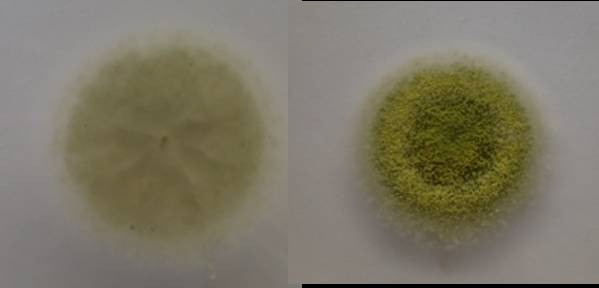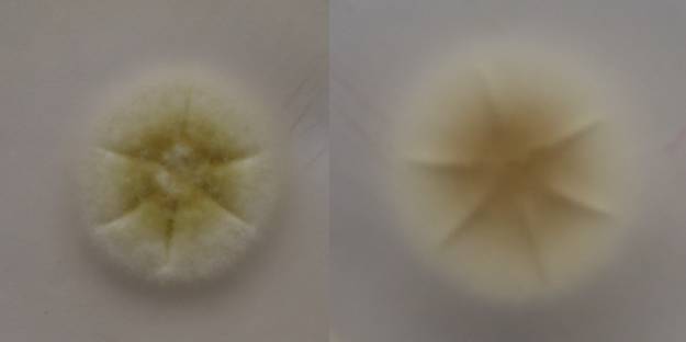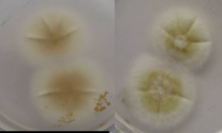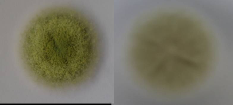 这几张图是不是培养同样长的时间拍的呢,如果是那么那几张中间呈淡绿色的霉菌可能是:灰曲霉、黄曲霉、灰绿曲霉这几个常见的,具体的要看显微图片啦。