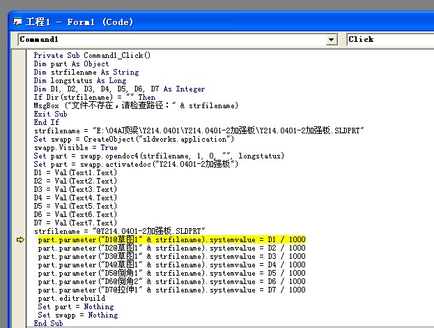 我最近用VB对sw搞二次开发,运行时老是弹出来“实时错误91”,“对象变量或with块变量未设置”。出问题也总是相同的语句。搞了几天也搞不定,请高手帮忙啊...