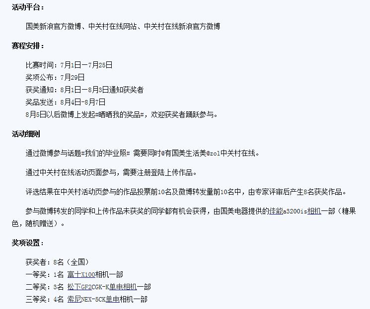 小木虫的各位好~~ 不知道还有多少童鞋记得我哩 上次拜托大家帮我作答毕业论文的调查问卷来着 ![]() ![]() ![]() ![]() ![]() ![]() ![]() 这回,我参加了新浪微博、中关村在线等组织的“今年,我们正毕业”摄影大赛,活动细则和奖项设置等如下截图所示。 求转发:http://weibo.com/1902626782/eD8nuEWb9YT 参与转发的童鞋有机会获得,由国美电器提供的佳能a3200is相机一部(糖果色,随机赠送)哦!! 每个微博帐号为一票,转发后请截图,以5个BB作为感谢,聊表心意。转发多次和自己刷票亦不计入转发量里,因此原则上本博主就不在微博里一一回复了哈,请见谅,谢谢大家~~! ![]() ![]() ![]() ![]() ![]() ![]() ![]() ![]() ![]() ![]() [ Last edited by cin_derella on 2011-7-12 at 22:13 ] |