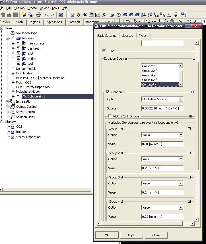 各位CFX大侠们,我计算一个无搅拌的气液两相体系,整个区域采用subdomain产气,采用musig模型,气泡设了5组,直径从1-6mm,不知道为什么size fraction总是不收敛? 还有一个就是我在设定中,subdomain下,Fluid 下,continuity中对各个组的group.sf是啥么意思啊,找manual也找不到。 各位给点帮助,先谢过了。 |