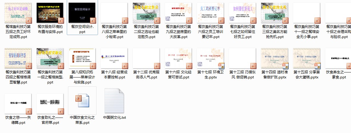 挺不错的课件 不知道来源何处 对餐饮行业从选址 经营 管理到如何做大做强都有详细的介绍 如果想自主创业从事餐饮行业或者想了解中国的菜系文化的话 相信这份PPT会对您有所帮助 |