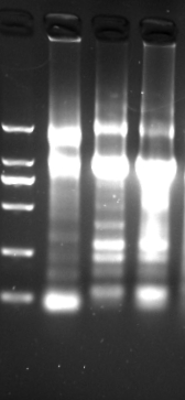 这是我提的RNA,第一道是植物中的RNA ,用Trizol法提的,第二道是昆虫细胞的,用试剂盒提的,第三道是昆虫组织的,也是用试剂盒提的,中间怎么会有那么多小带呢,是降解的吗,感觉又 不像啊 降解应该是拖尾啊 不会这么有规律吧 期待各位高手的解答